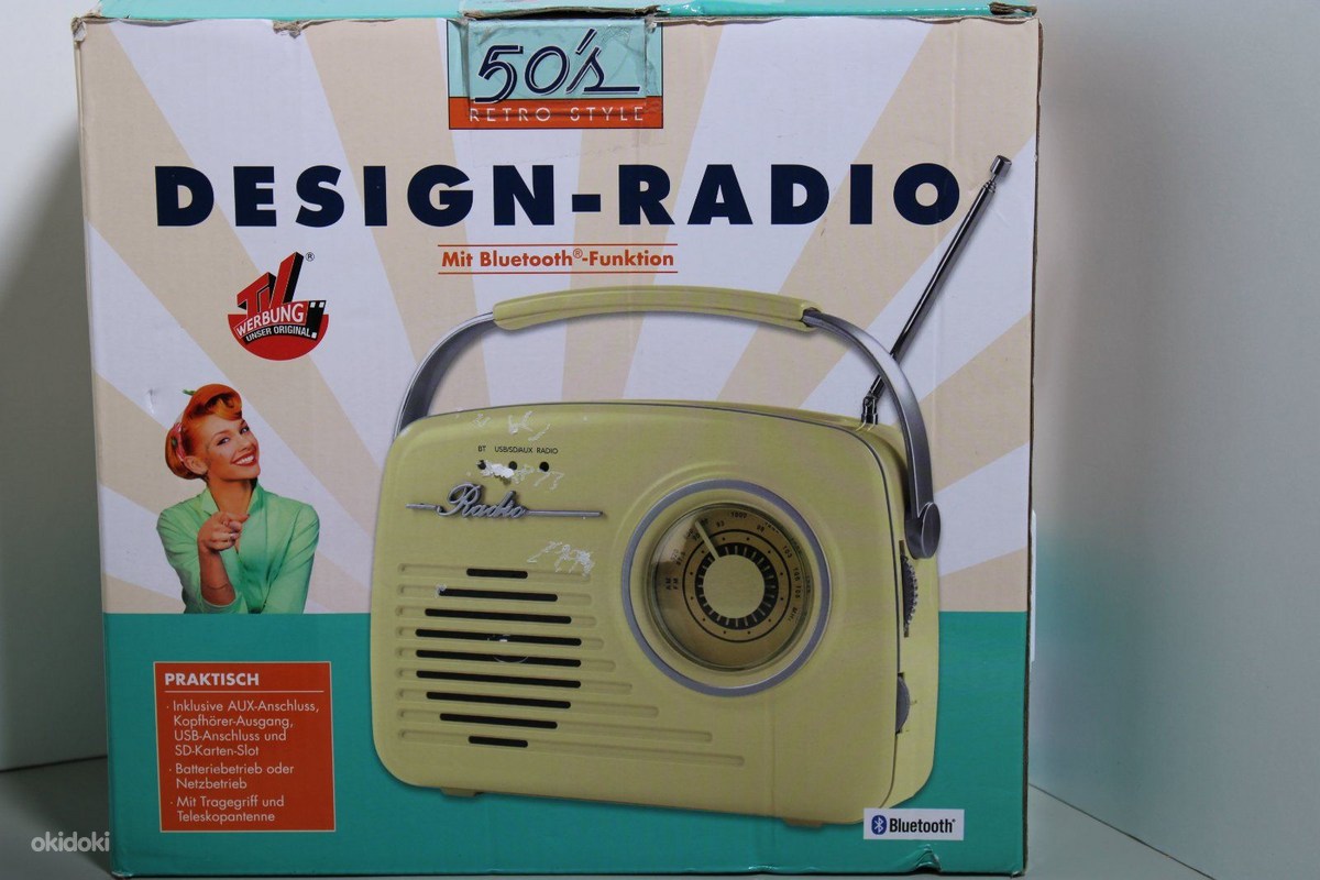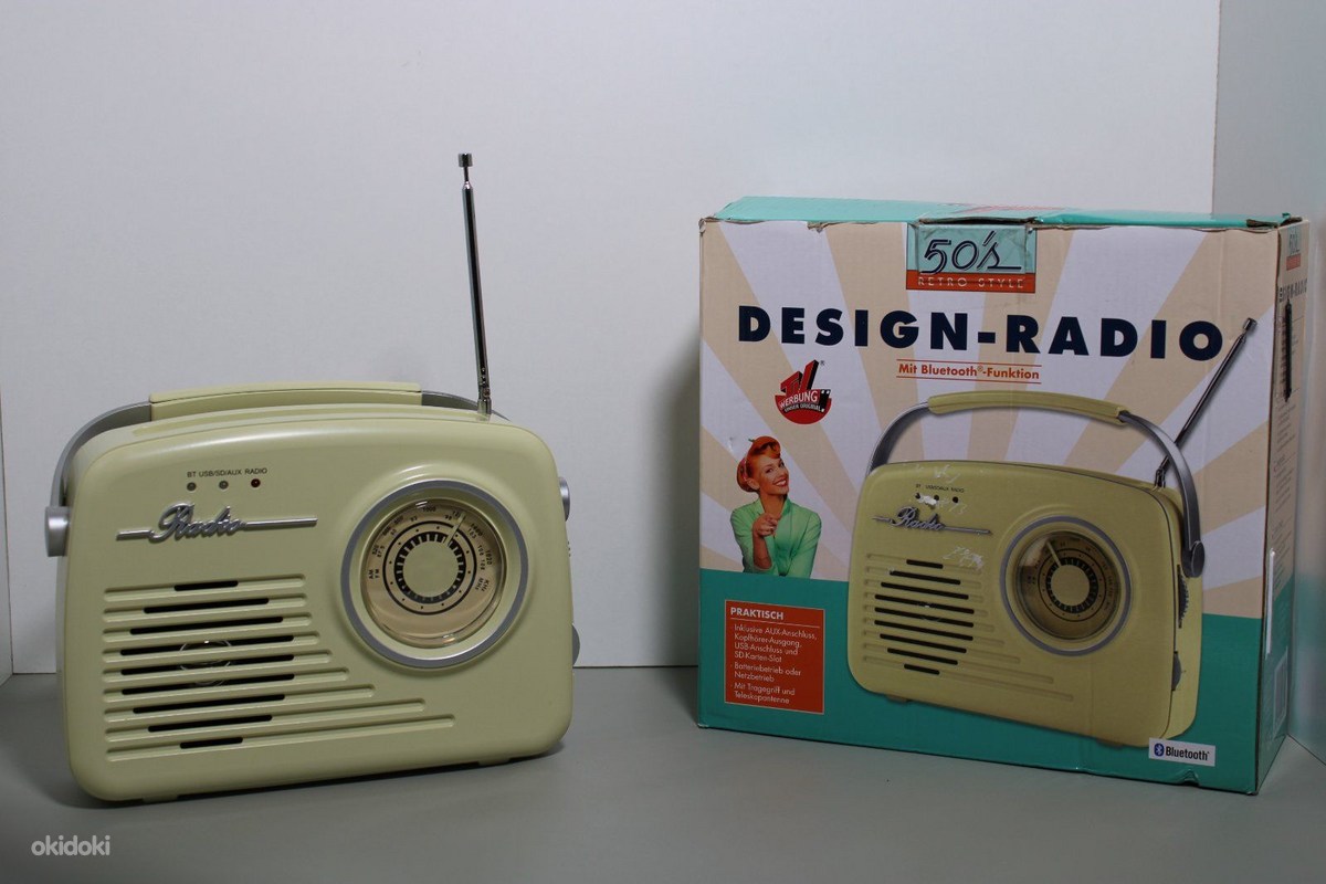 The “DESIGN-RADIO 50s Retro Style” is a vintage-designed radio featuring Bluetooth connectivity, AM/FM bands, and a telescopic antenna. It includes a USB port, AUX input, SD card slot, and headphone output. Sized at 21 x 6.5 x 19.5 cm and weighing 0.5 kg, it operates on 4 x Baby C 1.5V batteries (not included) and is available in two colors.